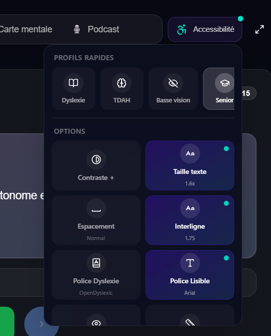 La particularité originale de cet outil est la présence d’un bouton d’accessibilité numérique proposé directement de manière visible comme fonctionnalité au sein de l’interface. De nombreux choix de paramétrage sont mis à disposition des utilisateurs selon leurs besoins.
