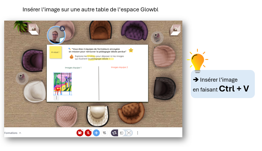 Cette page blanche est collaborative et permet à l’animateur comme aux participants d’ajouter, du texte, des images. Jusque là rien de révolutionnaire … sauf qu’il est maintenant possible avec un simple « copier » de naviguer dans l’espace Glowbl avec des objets que l’on peut transposer d’une table à l’autre.